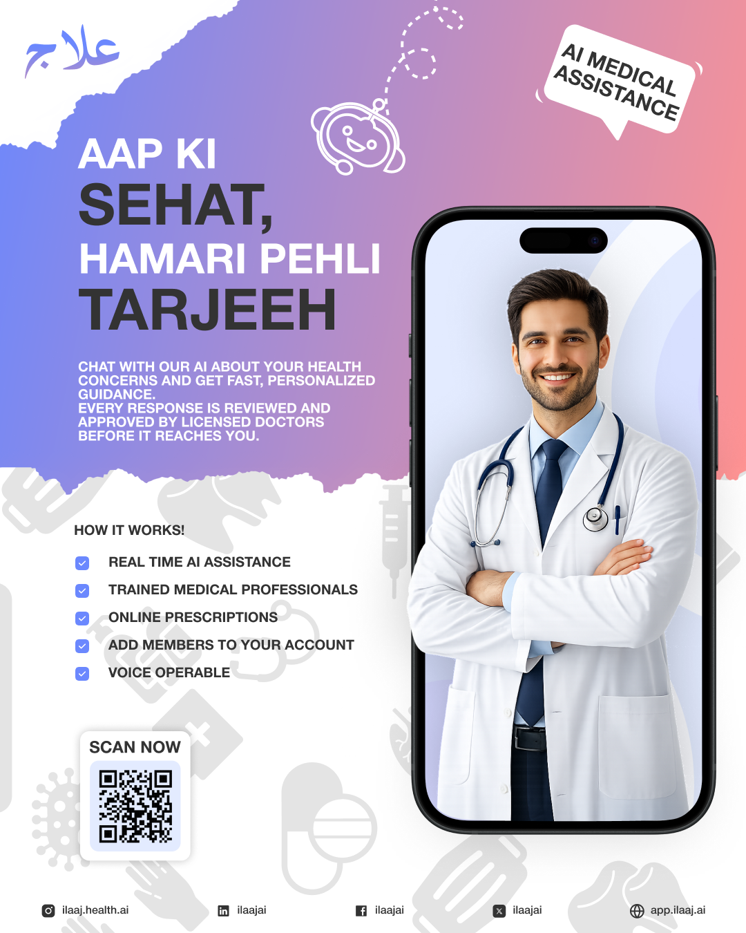IlaajAI — Pakistan ka pehla AI-powered health companion — ne yeh sabit kar diya hai ke aap ghar baithe, bilkul free, ek licensed doctor se approved prescription hasil kar sakte hain. Sirf apni takleef batao, baaki AI sambhal lega.